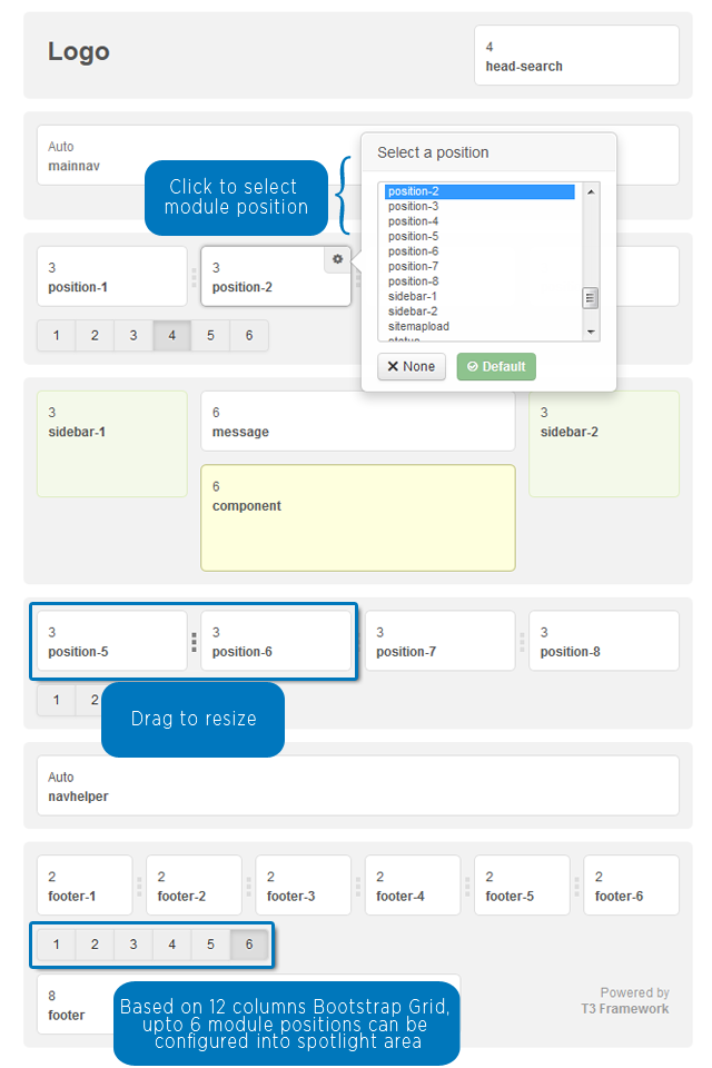 The Layout Configuration tool allows you to quickly assign a specific module to a block, and resize your module position by dragging the slider bar with absolutely NO coding involved.