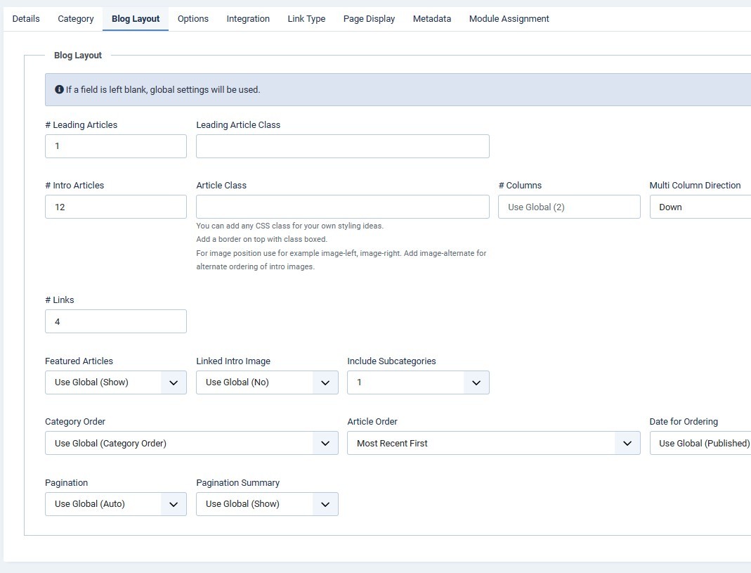 I am using JA Tour template and want to have a category page that shows one leading article and 12 intro articles in two columns. No matter what I try, I get one leading article, 2 intros in two columns, and the rest of the intros in two columns squeezed into one column. See attached images. Please advise. Thanks.