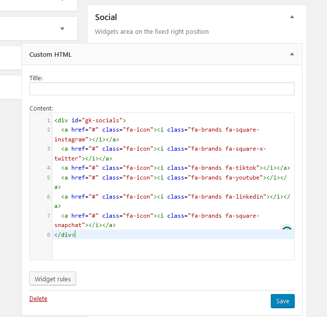 Go to the backend > widgets > add the HTML widget to Gk Social and add the following code: