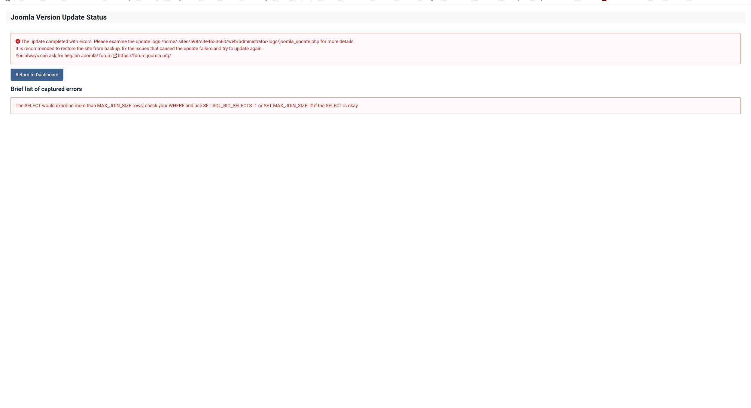 Notice The update completed with errors. Please examine the update logs /home/.sites/598/site4653660/web/administrator/logs/joomla_update.php for more details.