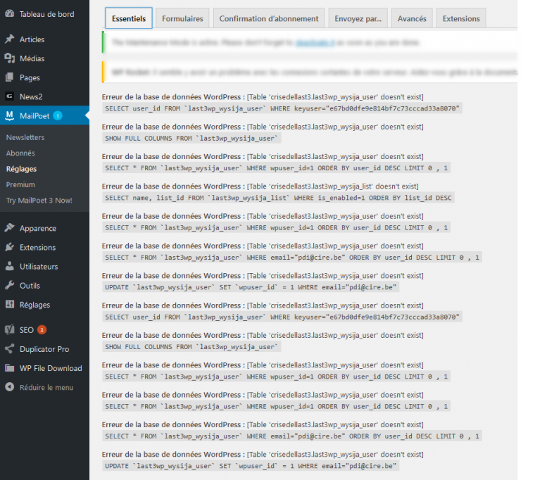Erreur de la base de données WordPress : [Table 'crisedellast3.last3wp_wysija_user' doesn't exist]