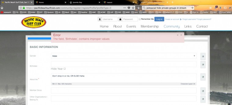When testing the registration form on our site (using multiple profiles) I noticed that if an error occurs there is apparently no way to backtrack to the previous screen without losing your already inputted info. To test this, just go here and try to register a fake account: https://pacificbeachsurfclub.com/community/register In this case the Birthdate field was the issue: The only thing I could try was using the browser's back button, but this wiped out all of the info from the previous screen. Is there a fix for this? Thanks!