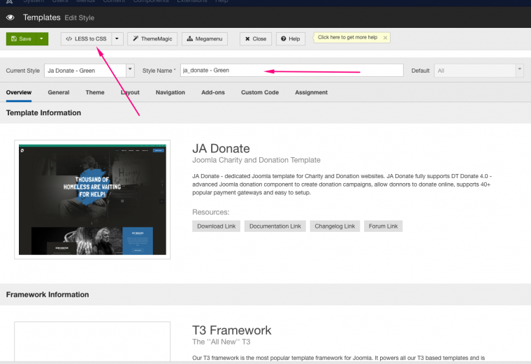 Save file and go to templates -> Style - edit your template style using the Green style and compile less to css