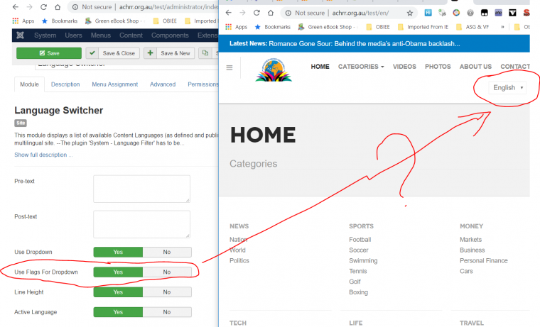 - Make the following changes to the settings of the language switcher module: