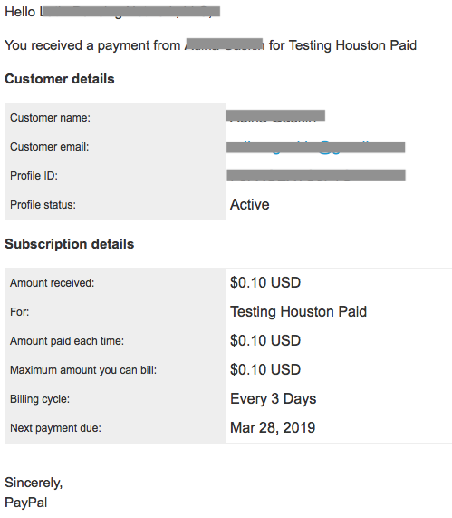 On 3/25/19 (3 days later) the site test user recieved a notification from PayPal that they charged and payment was sent to my site.