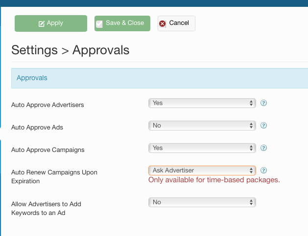 I'll also add that the setting under approvals is set to "Ask Advertiser"