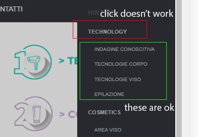In off canvas parents-menu with submenu (technology, cosmetics, ...) doesn't seem to work. When click on them, the redirect to specified pages doesn't work. Instead, sub menus (indagine conoscitiva, epilazione, ...) work correctly. How can I fix it? Thx