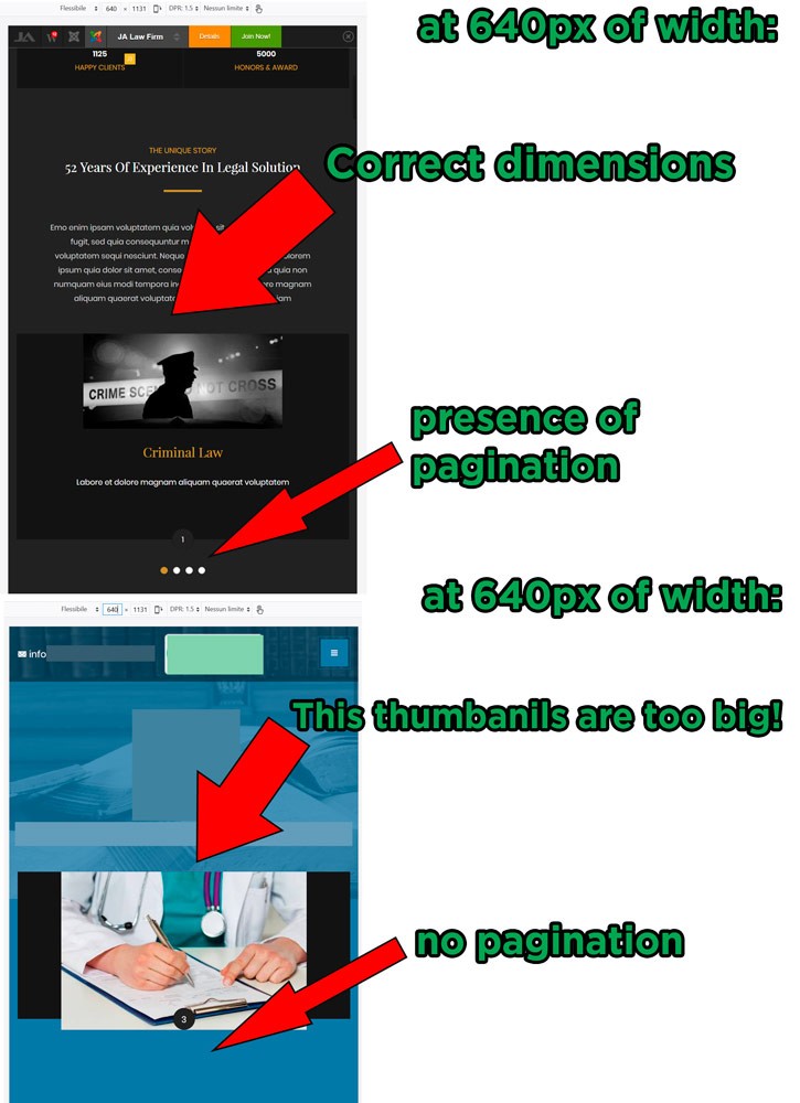 When the width of the screen decreases under 641px, and also goes to below of this, the thumbnails of the acm-features-129 module become too huge and the pagination is absent. At other screen width the dimensions are ok, but the pagination is still absent.