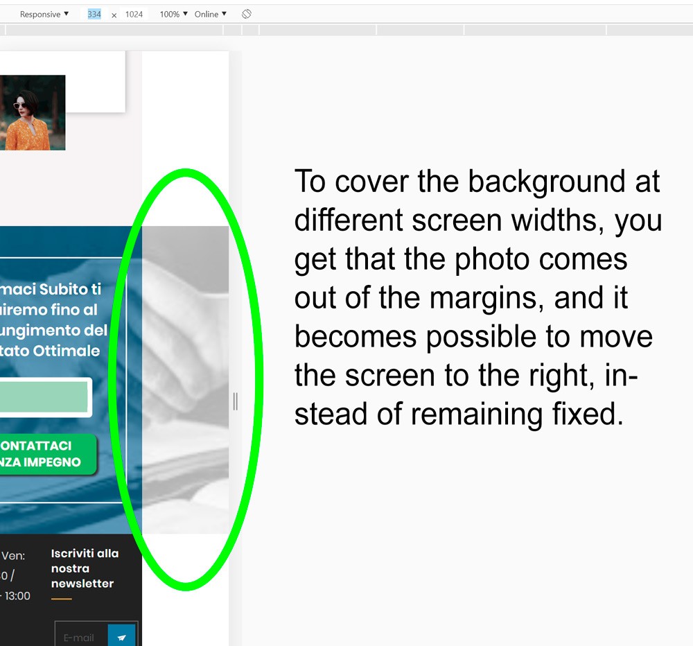 for all screen widths between 220px and 1500px, through mediaqueries, and filling the background by enlarging the photo. The module performs well in all widths, but there is the error of the photo that comes out of the margins. It becomes possible to move the screen to the right, instead of remaining fixed.