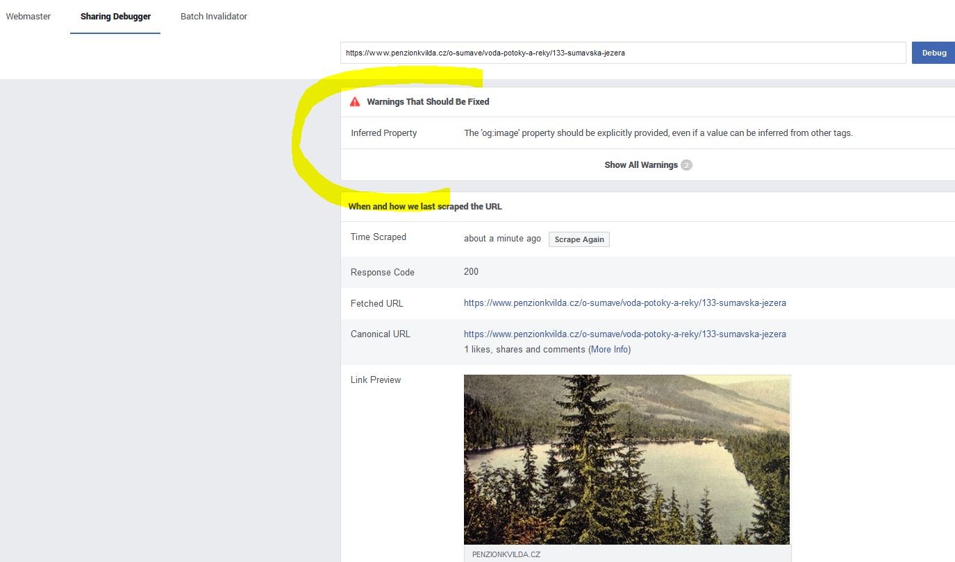 Facebook Sharing debugger output (see attachement) - with some bugs, display preview image in debug, but not on Facebook post.