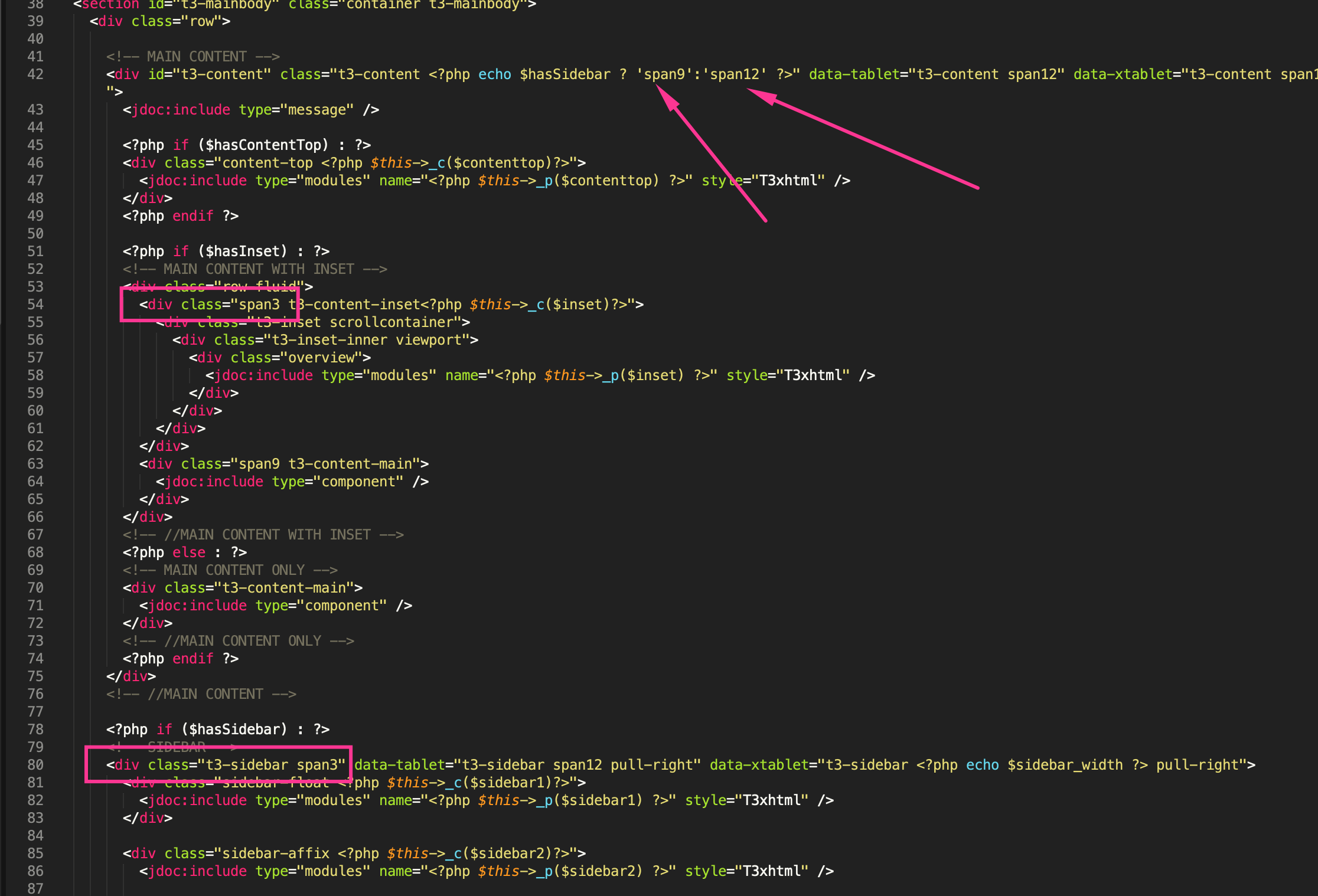 For example, the total grid is 12 (12 span), the inset is span3, when you change the right sidebar to span4, the main content section's width will be decreased.