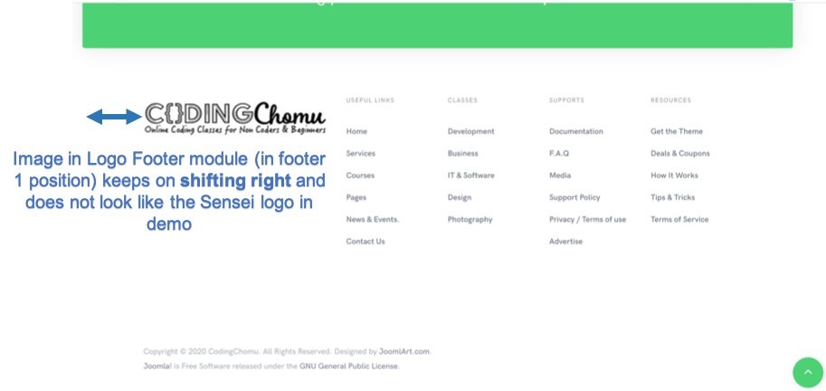 Image in Logo Footer module (in footer 1 position) keeps on shifting right and does not look like the Sensei logo in demo. Kindly see the attached image.