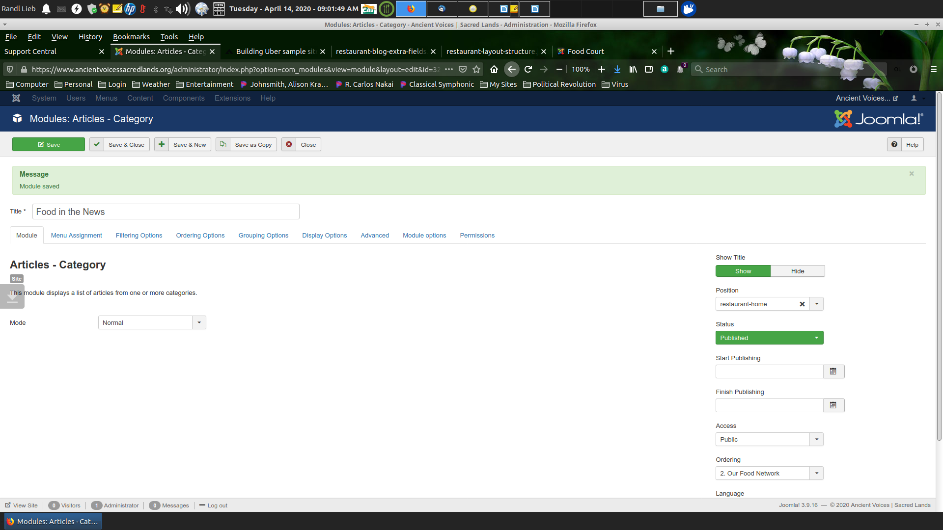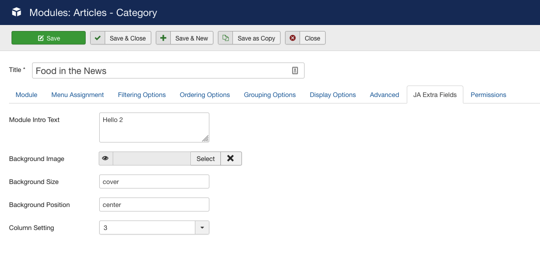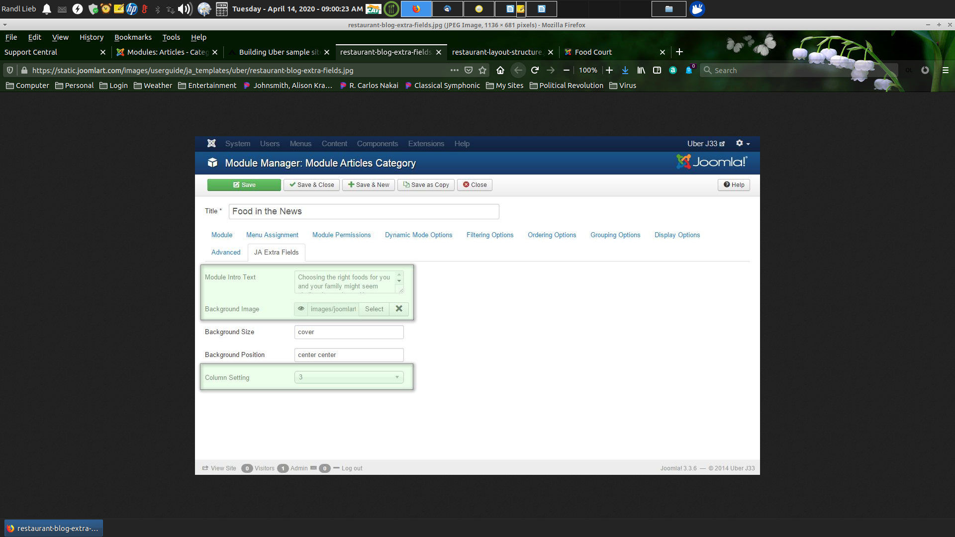 I am creating a restaurant page in Uber. Using the ACM I tried to set up the 'Food in the News' in the Articles Category Module. On the 'building uber sample sites' how to page it shows an 'extra fields' tab showing in the module but I see nothing on my admin end. There is a 'module options' tab but it does not show the same parameters that the 'extra fields' tab shows. How do I get the 'extra fields' tab to show in the 'articles category' module. Thanks.