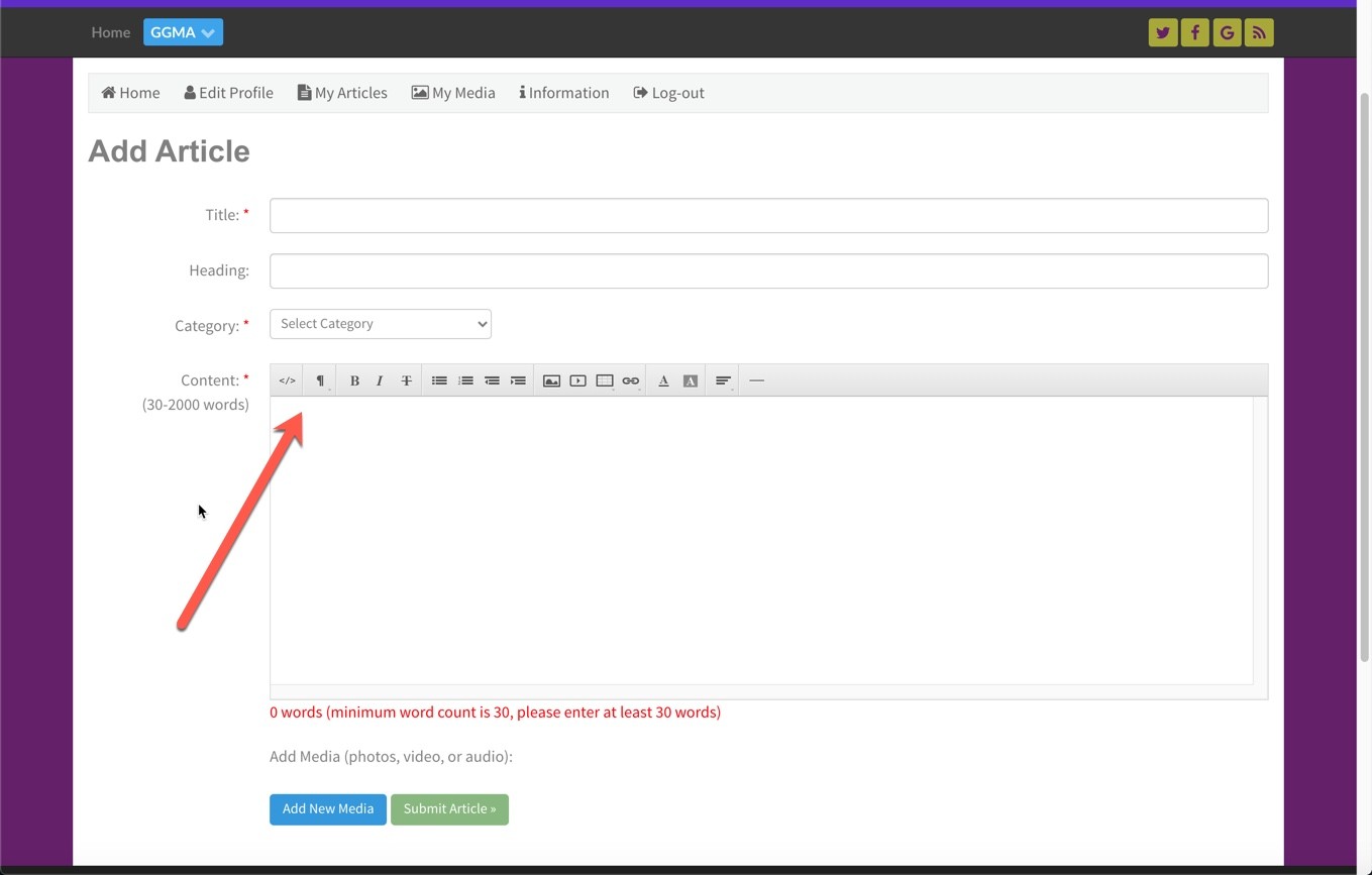 - Add a "hint" to the initial editor "Content" textarea field. I would like to display to the user something along the lines of "Please provide as much detail as you can for your submitted article, etc."