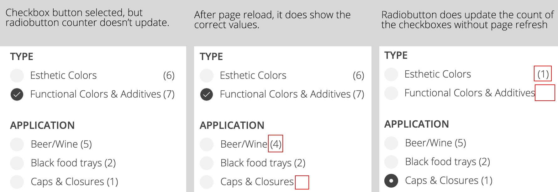 The other way around, so when I select a checkbox, the counter of the radiobuttons isn't updated, until i manually refresh the page. After refresh, it shows the right values.