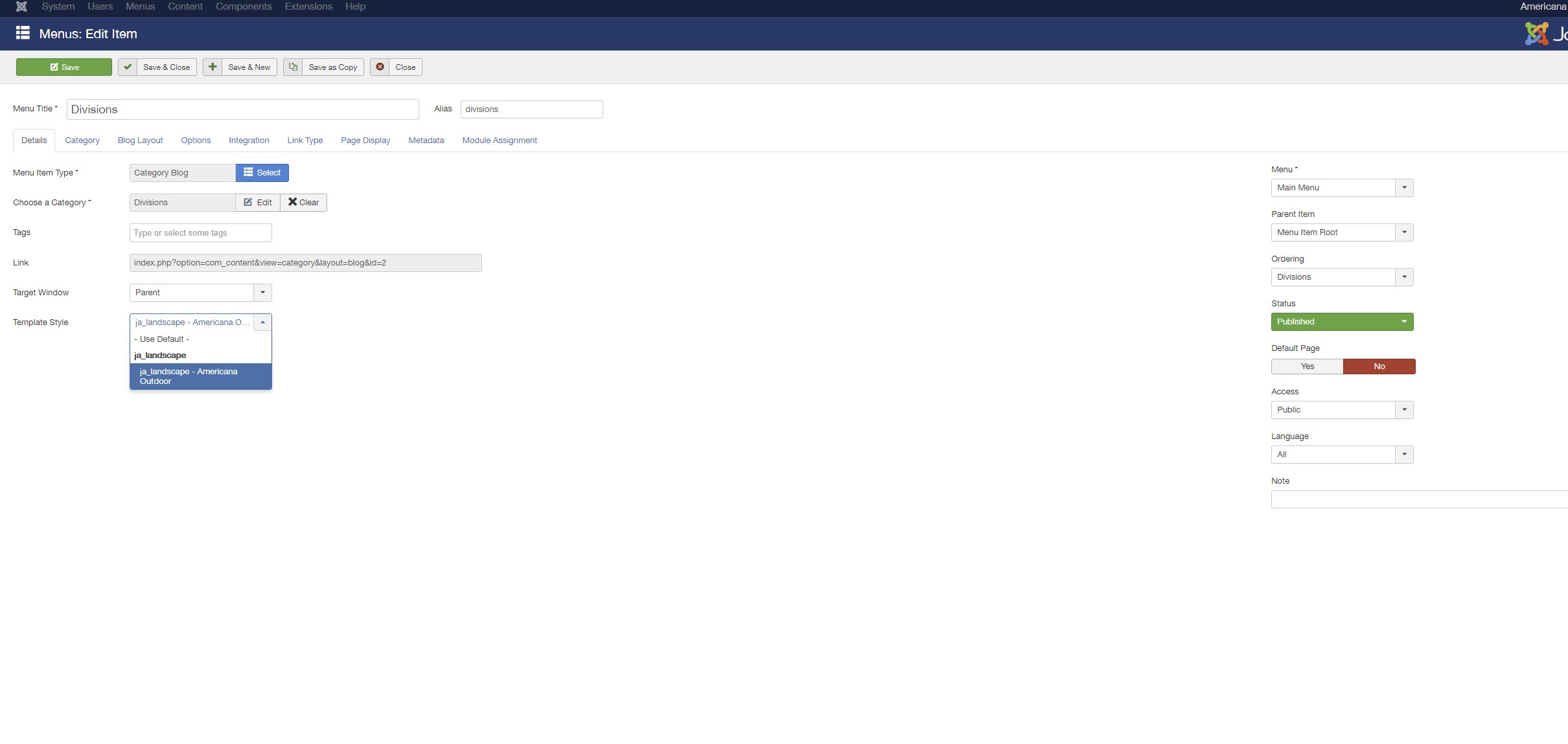 Here is a screen shot. The "Divisions" page I have set up is suppose to mimic the template "Services" page. As you can see, under the template style drop down...I do not have the "projects and services" template style available. The "Americana Outdoors" is the default template style renamed.