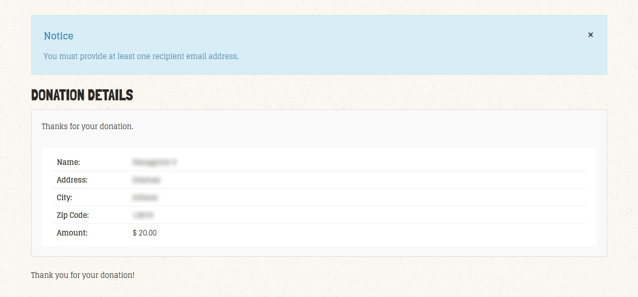 Hello I've made a test to donate to my website, and the donation was successful. But I receive the following message over the details of the donor: