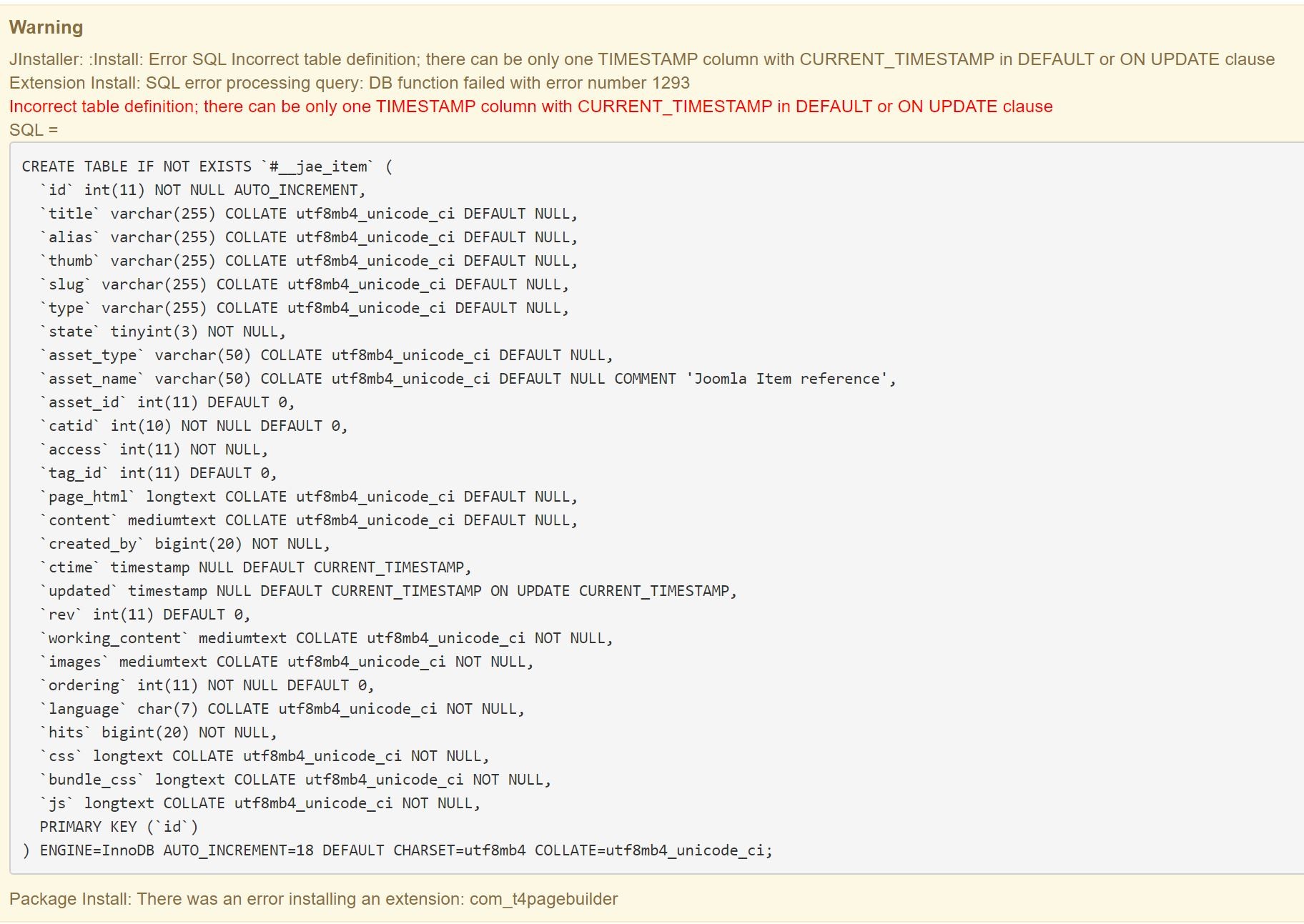 I am able to install T4 Page Builder in an installation that uses a MySQL database. In a Joomla installation that uses MariaDb MySQL, however, it fails to install with the message, "Incorrect table definition; there can be only one TIMESTAMP column with CURRENT_TIMESTAMP in DEFAULT or ON UPDATE clause". The database table #_jae_item is not created.