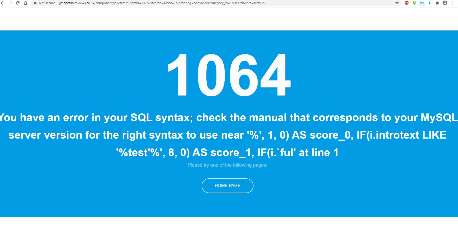 You have an error in your SQL syntax; check the manual that corresponds to your MySQL server version for the right syntax to use near '%', 1, 0) AS score_0, IF(i.introtext LIKE '%test'%', 8, 0) AS score_1, IF(i.`ful' at line 1. See Img01.