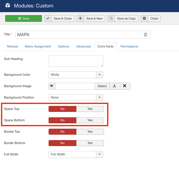You can disable the space on top + bottom via Extra Fields tab of this module