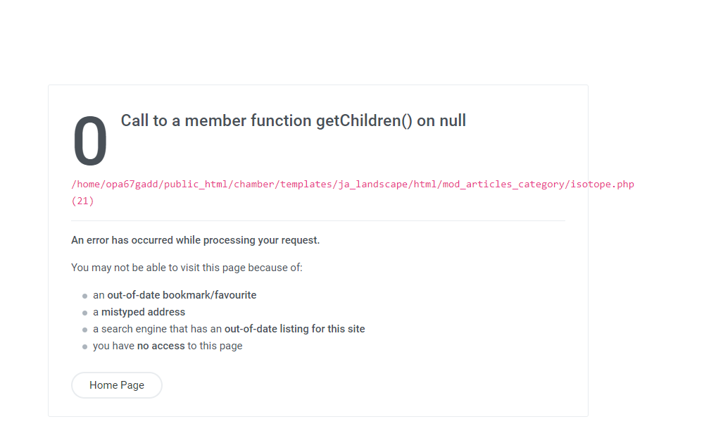 The homepage is giving an error code 0, not sure what could have caused it. I can't do a restore on the site since it would write over all the subdomains so I really need to get this figured out. I'm attaching a screenshot. I was working on SobiPro, but it isn't on the homepage. The rest of the site can be seen, but if you don't know a link to another page, then you really can't go anywhere. Joomla backend works too. Just the homepage isn't working.
