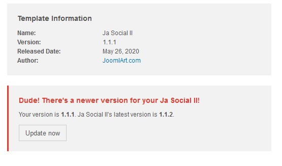 In template information panel a notification is showing 'Dude! There's a newer version for your JA Social ii' Current version is 1.1.1, new version is 1.1.2 - the new version is nowhere to be found. Does it exist and can you provide a link to it