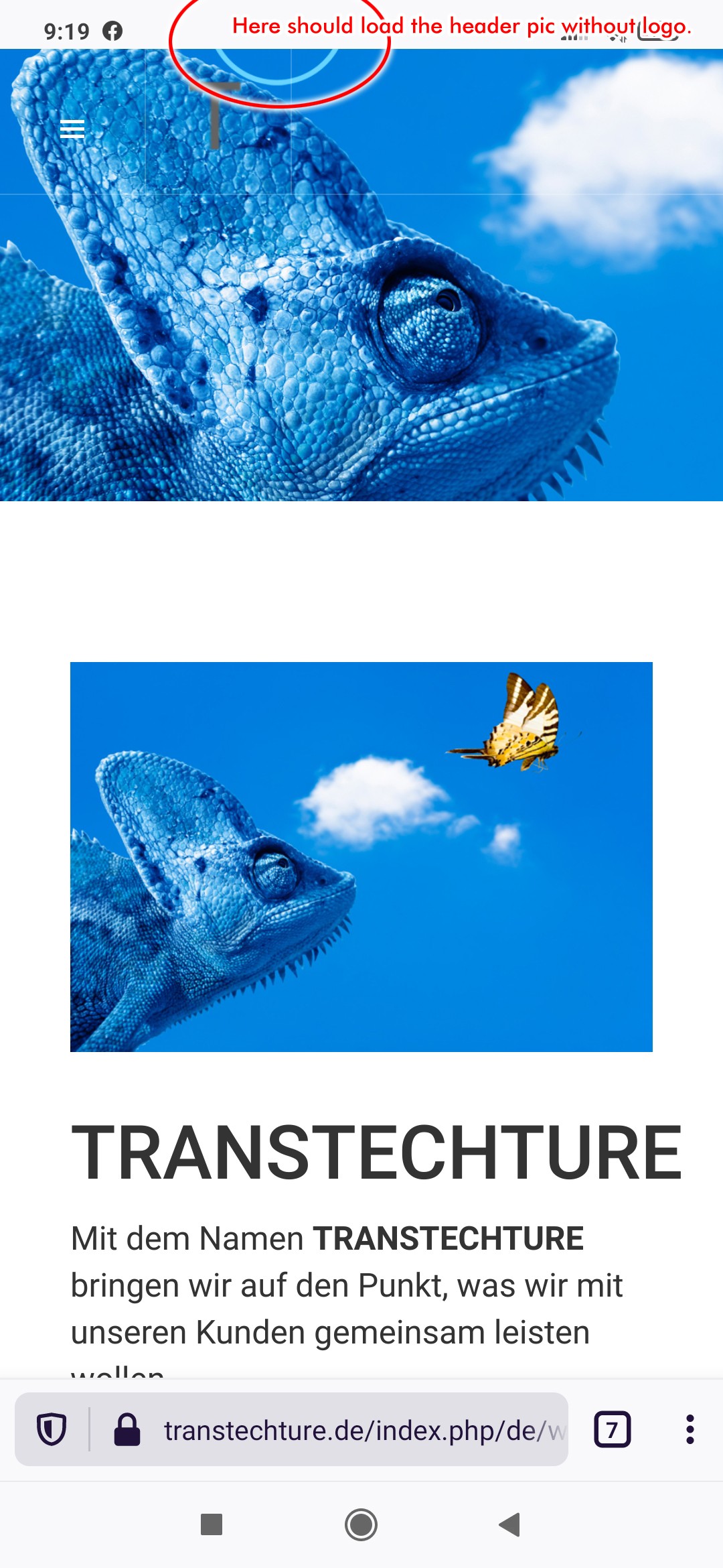 On normal, large desktop browser window, everything works fine, the blue chameleon picture (transtechture-header.jpg) loads with the logo inside.