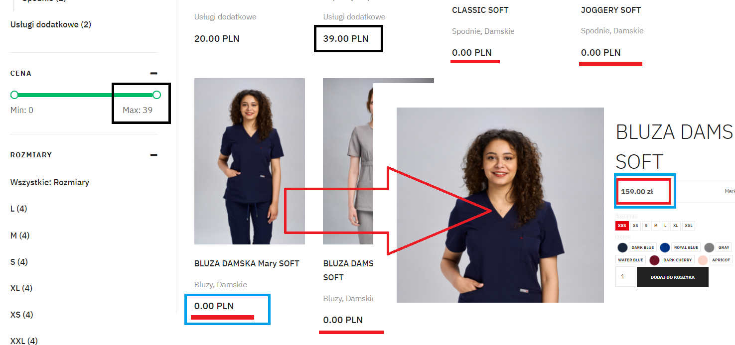I have a problem with vieving and sorting priceses. If you check the site: /kup-online you find products with 0.00 priceses. If you choose them you will see corect price like 179. The price sorter - horisontal scroll bar - don't incloude those prodacts too.