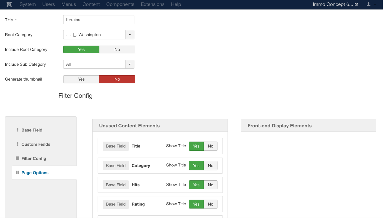 I have created a new filter in JA Mega Filter Component called “Terrains” and duplicated Menu Item “Properties” changing the second voice in Details “ID” from Properties to Terrains. The Root Category of the filter settings is set to subcategory “Washington” from the original content of the template.
