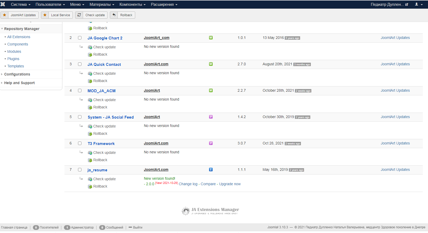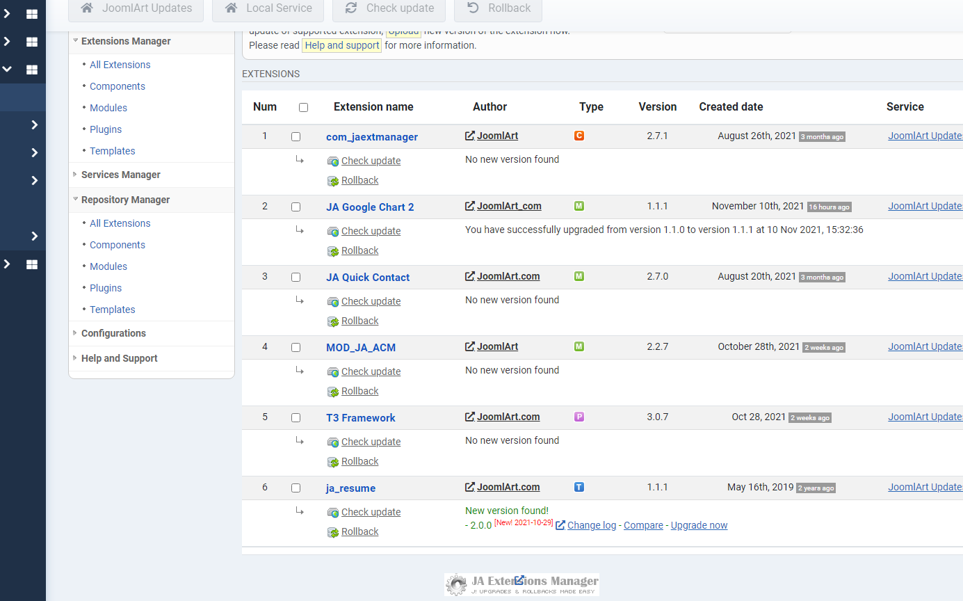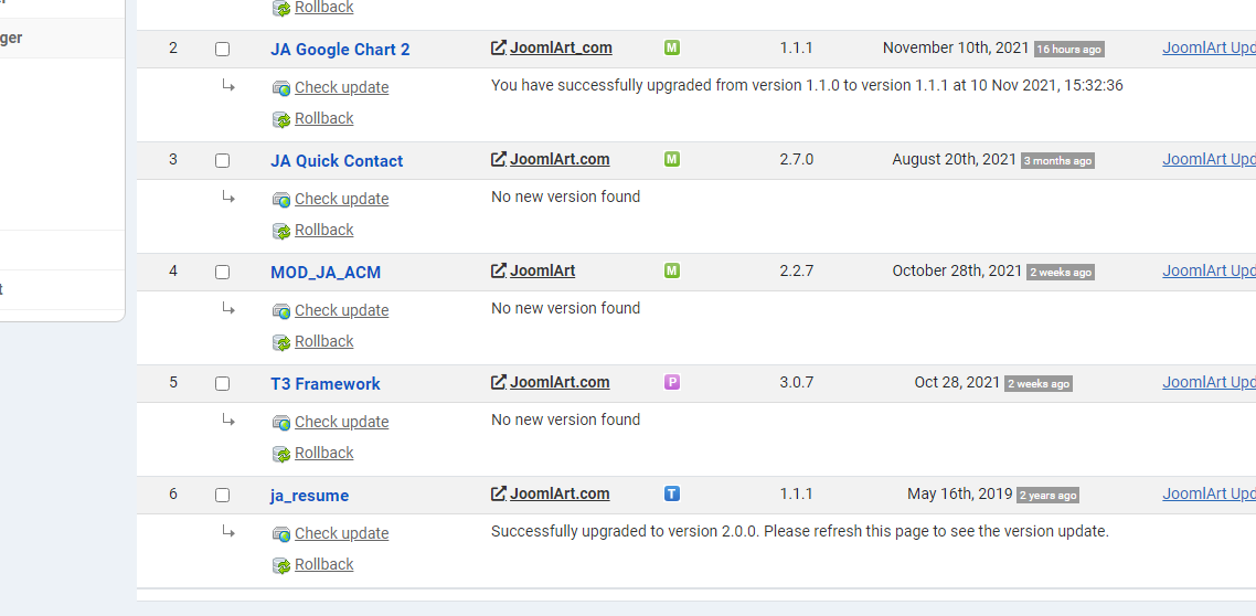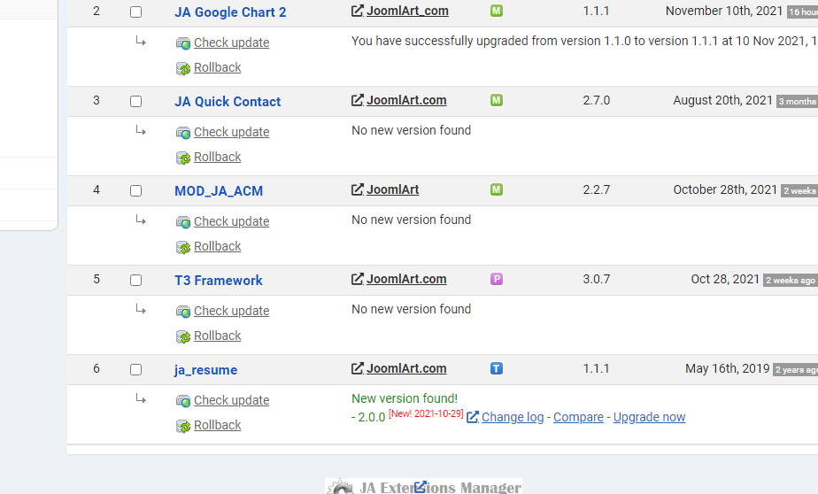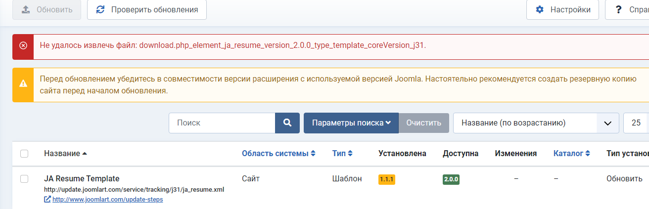 saguaros Hi! I have installed JA Resume for Joomla 4 quickstart to try Template version 1.1.1 cannot be updated to 2.0.0 Other extensions have been updated by JAEM successfully. Is it possible to check the template package?