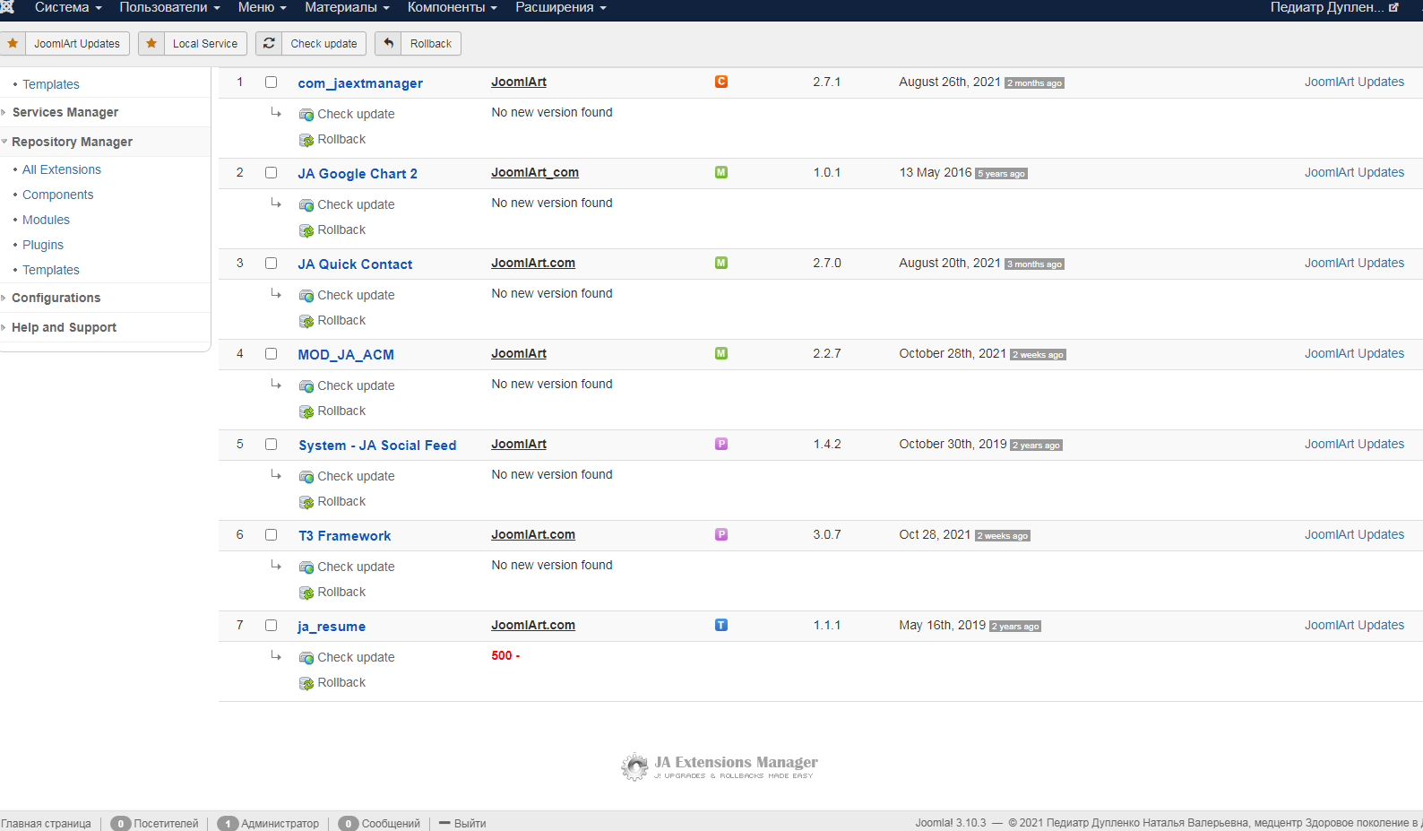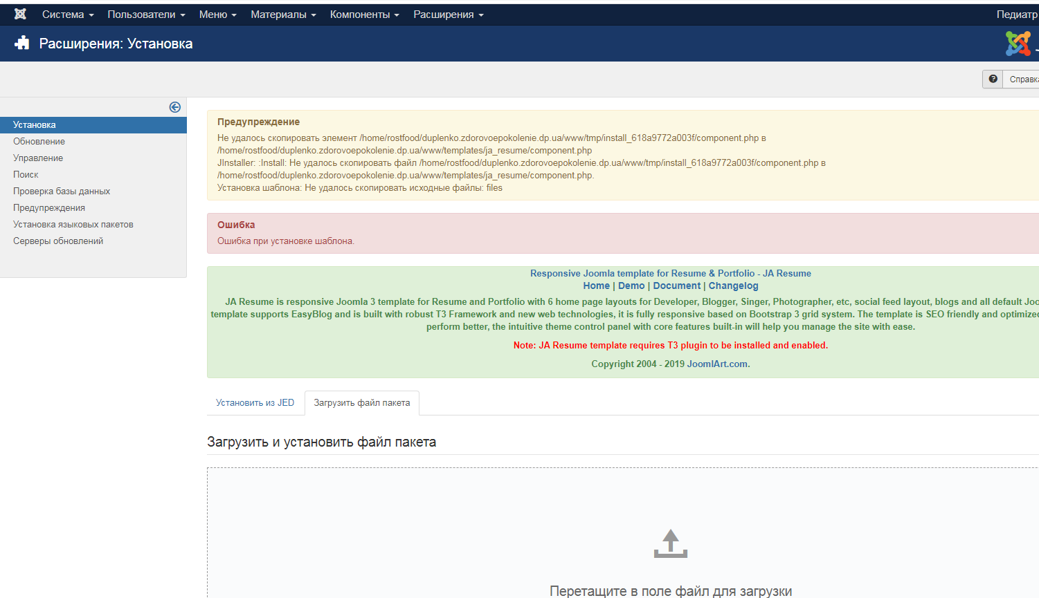 When clicking to upgrade on your site, it throws 500 error: https://duplenko.zdorovoepokolenie.dp.ua/administrator/index.php?option=com_jaextmanager&view=default&task=upgrade&ajax=1
