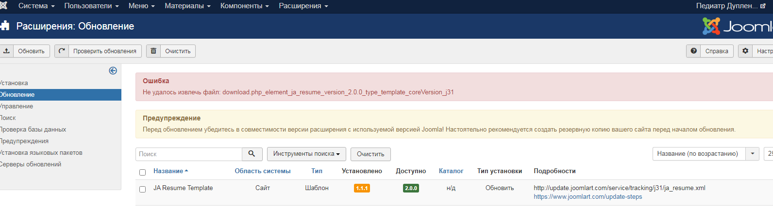 JA Resume Template upgrade to version 2.0.0 cannot be done