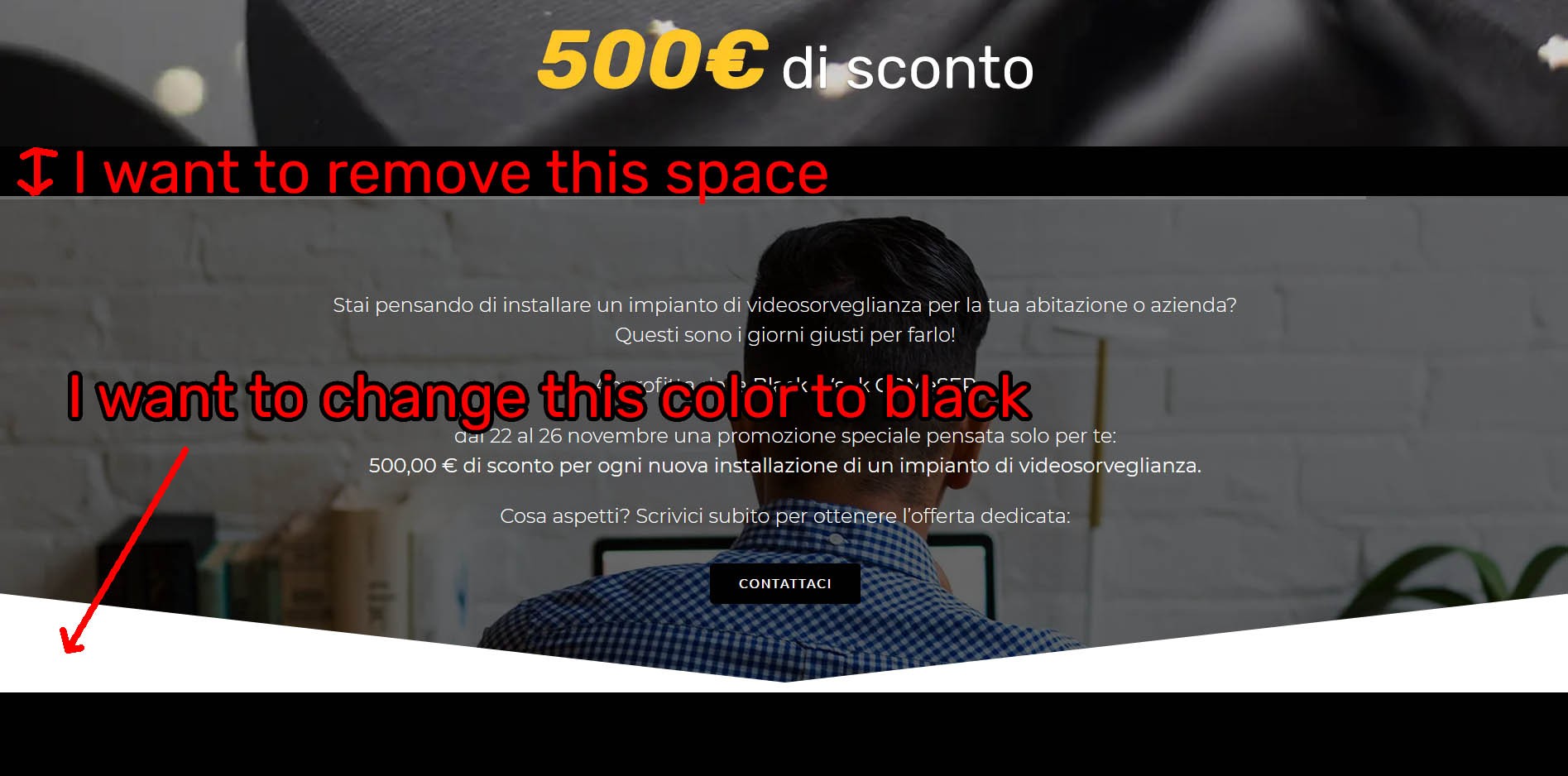 Hi, I need to make two changes to my template, the first concerns a space to be removed between two modules, the second thing I would like to change a color that I can't change, I have attached an image to understand where I want to make the changes.
