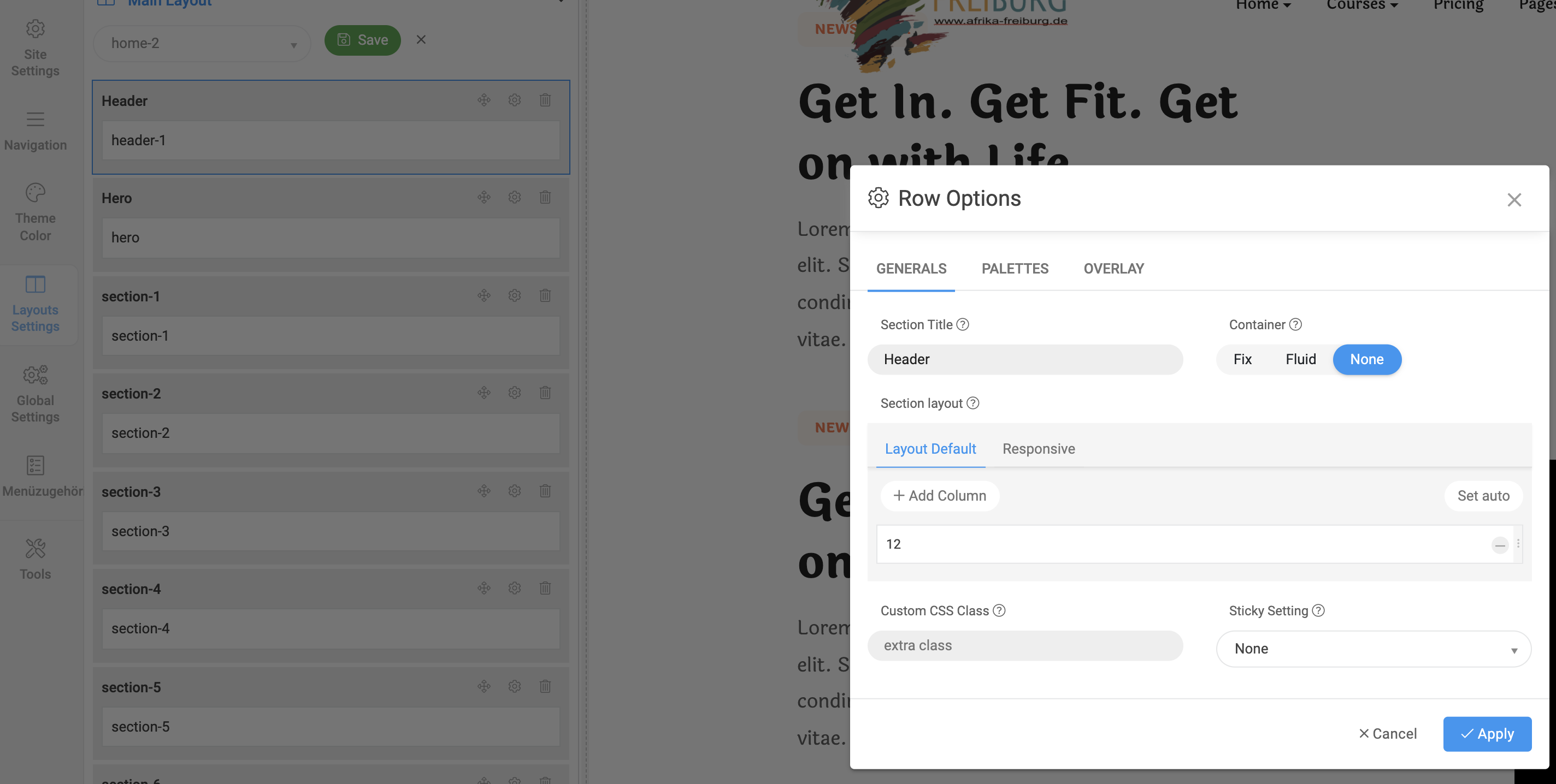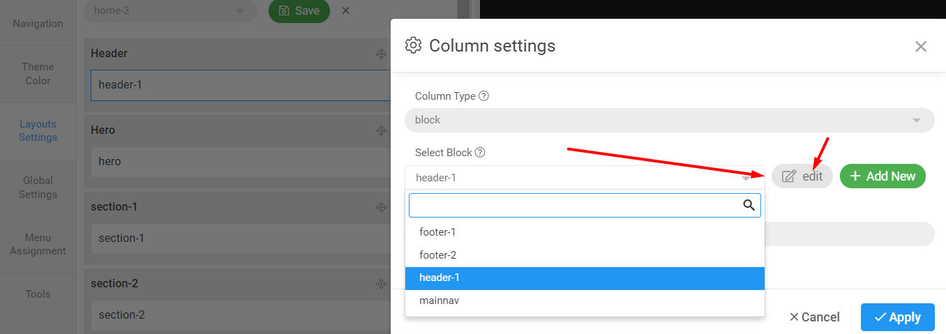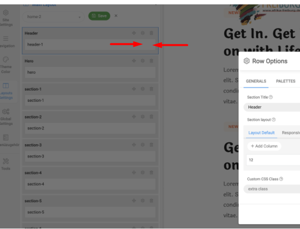 I am on the template style, Layout Settings, Header (header-1) and the pop-up shows Row Options only ....there is no way to switch to Column settings .....at least I am not finding it ...maybe I am totally blind ....sorry.