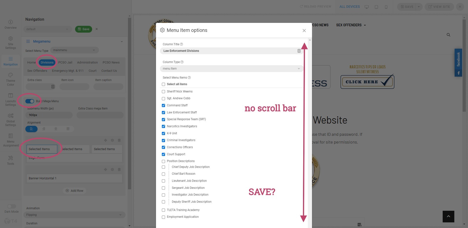 In attempting to set an item in the main menu, I am using mega menu. I need to add some items in the template side of the menu system, but when I go to add what I've already added in the menu system, it won't allow me to save it because I do not see a scroll bar top to bottom. I've tried several ways to grab it, but nothing works so far. I'm attaching a screen shot to help explain my problem.