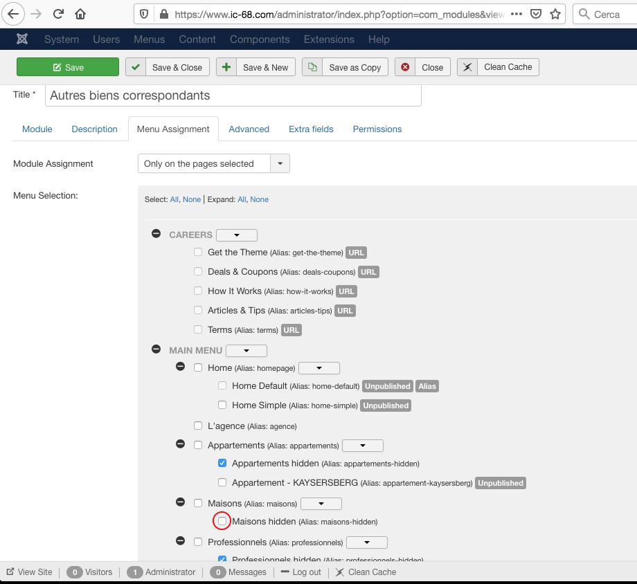 The problem is, it's still not possible to deactivate the module on the "Maisons" pages in the "Menu Assignment" tab. So I had to do it by removing "Maison" from the Meta Keywords tab in the content manager: