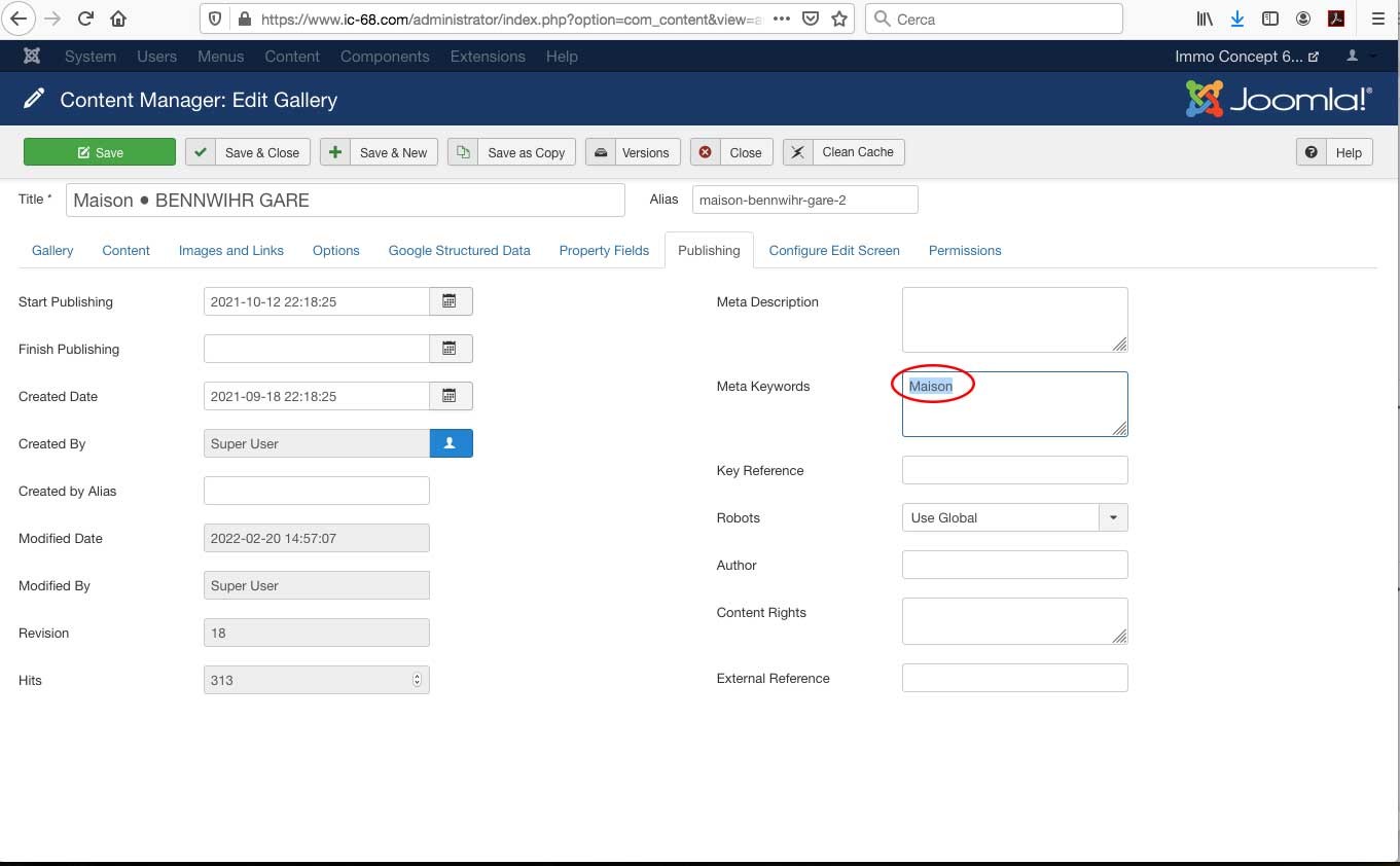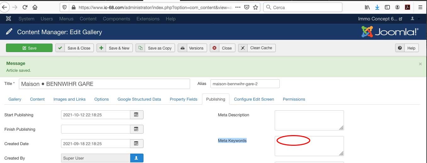 I did not remove "Maison" in the Meta Keywords tab in the other related item with Title "Maison ● BENNWIHR GARE" and Alias "maison-bennwihr-gare".