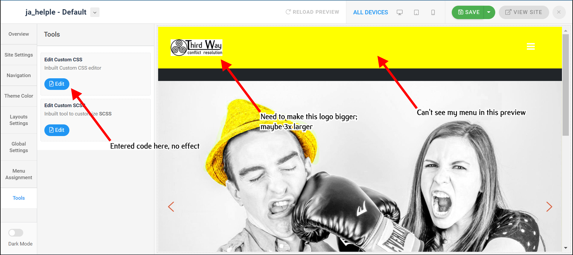 I did look through the forums, and added the code as per the post at https://www.joomlart.com/forums/d/36461-logo-customization, but without success... it seemed to have no effect.