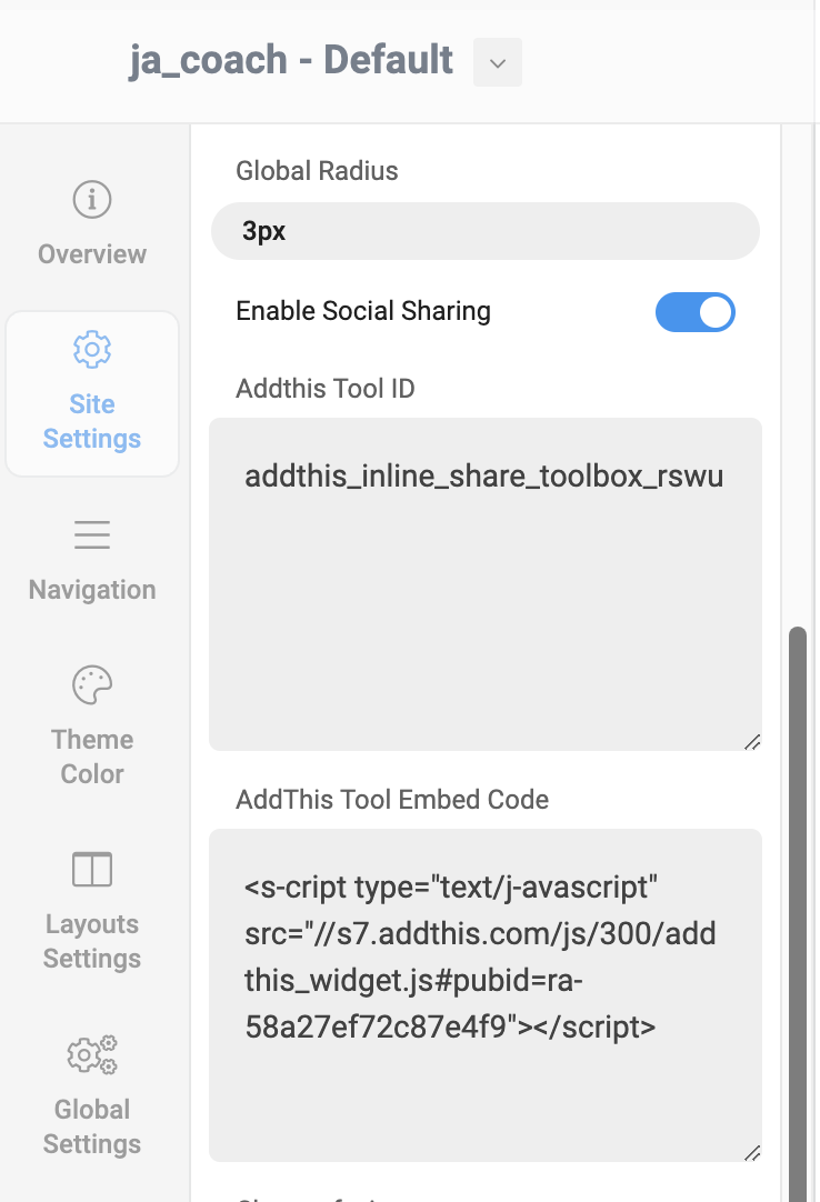 You need to go to AddThis site and generate your own code and put into template settings as my above screenshot.