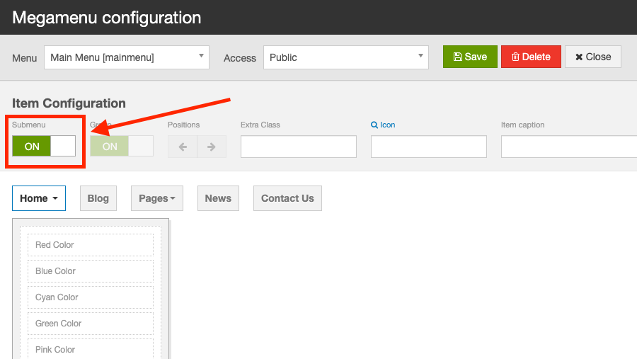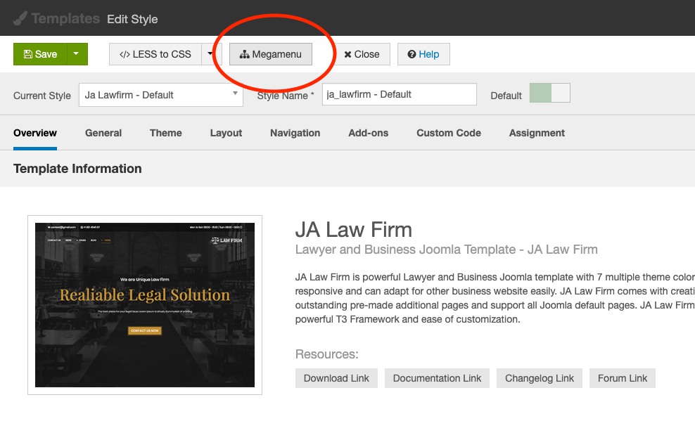 You can go to template style of JA Lawfirm template >> hit the 'Megamenu' button to navigate to Megamenu Configuration: