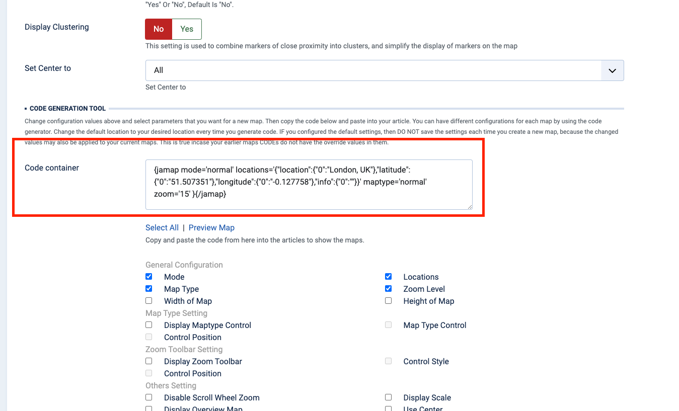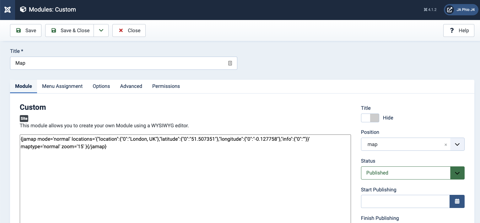 Then go to Modules >> find 'Map' module in 'map' position and paste the code that you generated above: