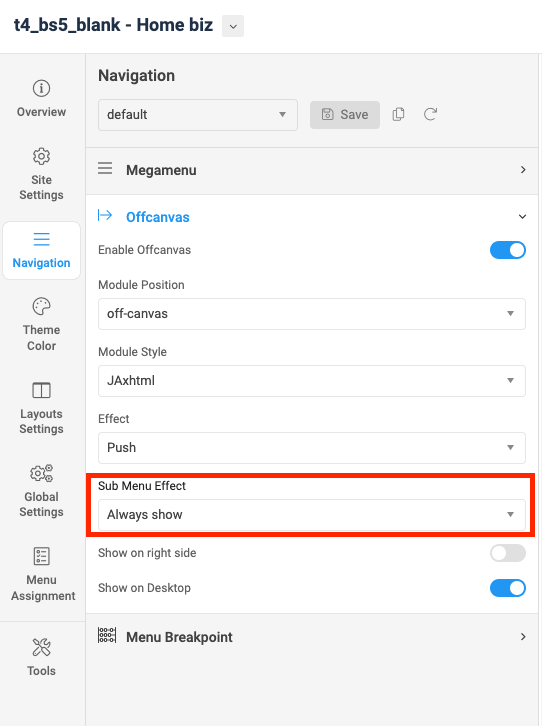 but when we use Offcanvas -> Sub Menu Effect -> "Always Show" we basically see "Accordion" effect (no difference between "Accordion" and "Always Show" settings).