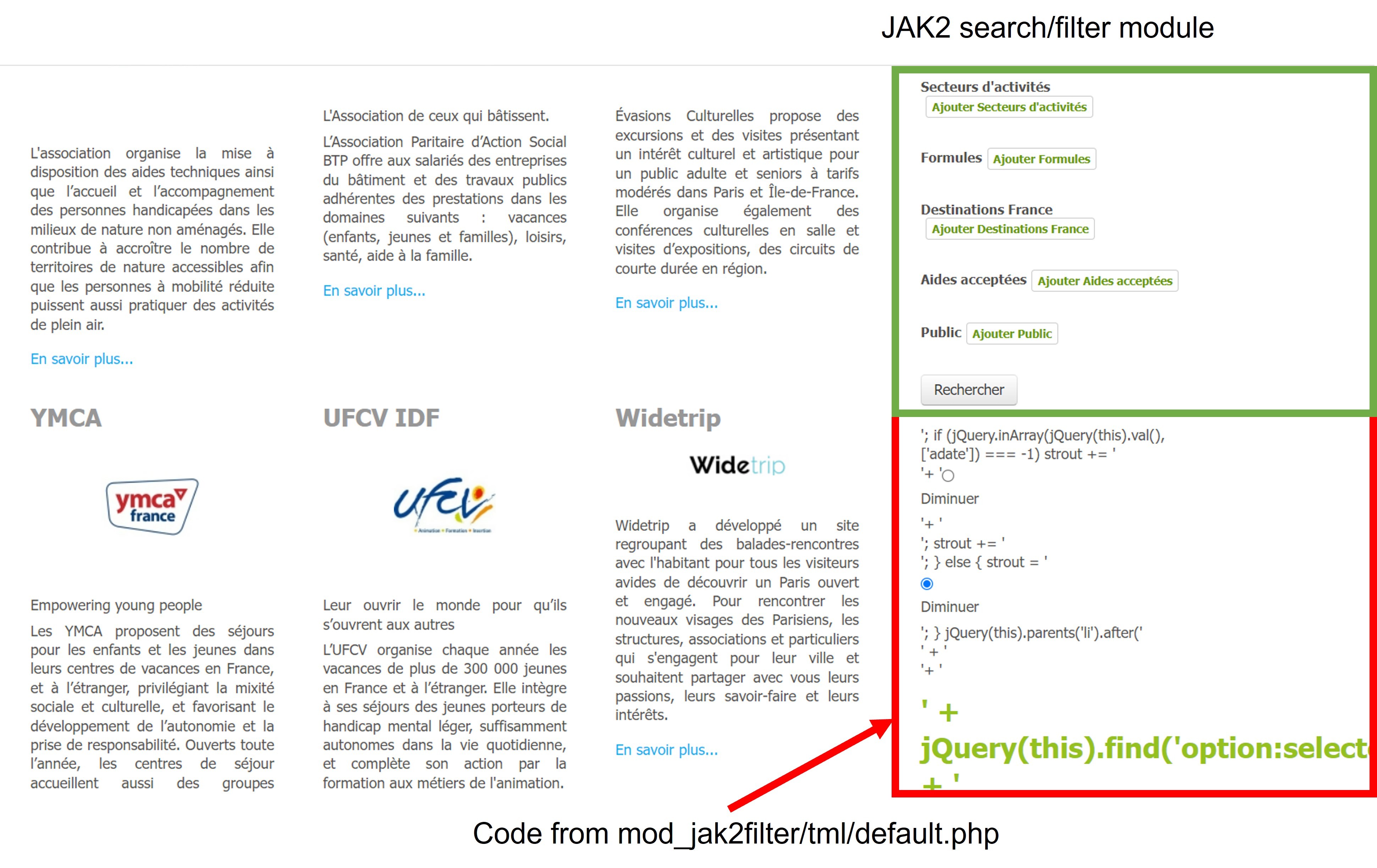 On the right, you can see the JAK2 filter/search module published with the title "Rechercher dans l'annuaire".