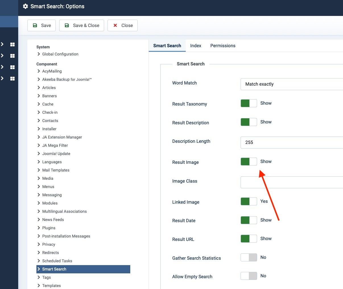 I added some custom code in file [html/com_finder/search/default_result.php] to display result image.
