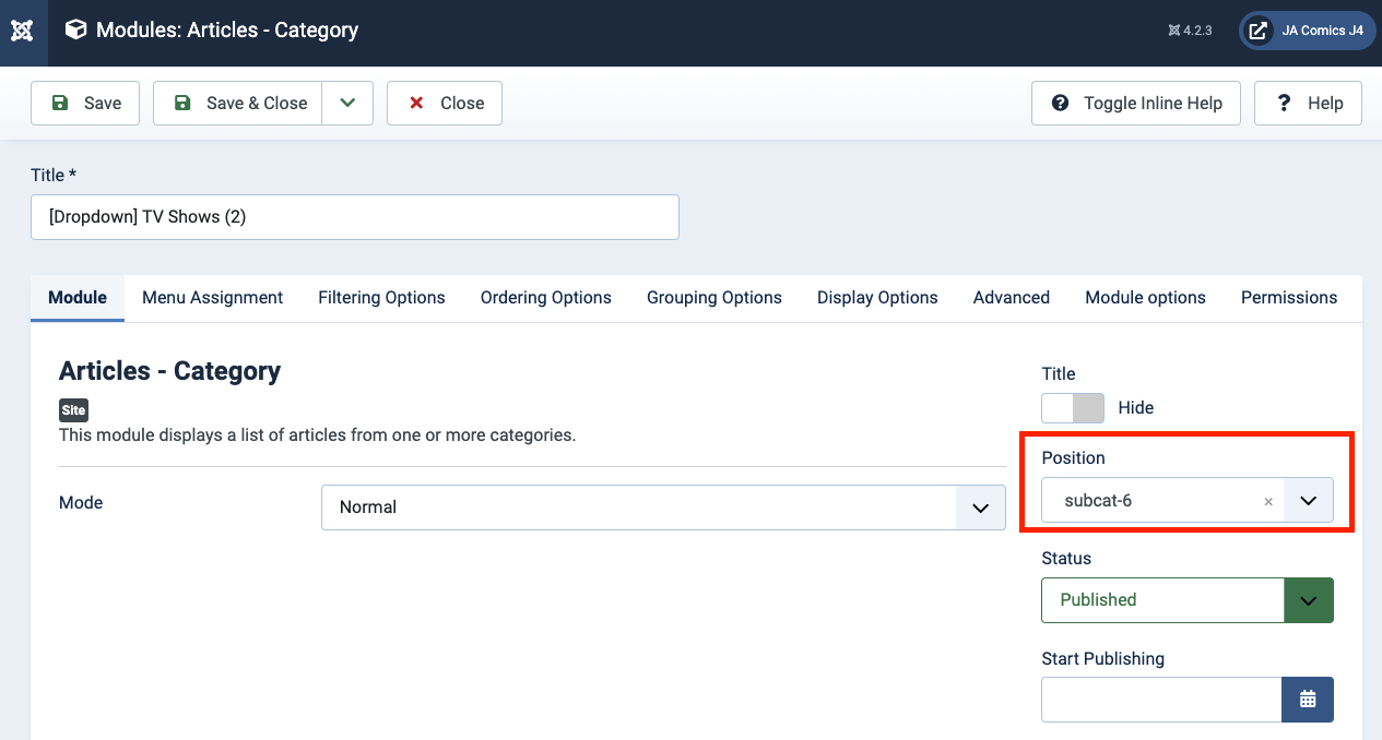 2/ Create new modules type of Articles Category to load articles from these 2 new categories 6 & 7. Then assign to associated position: subcat-6 and subcat-7
