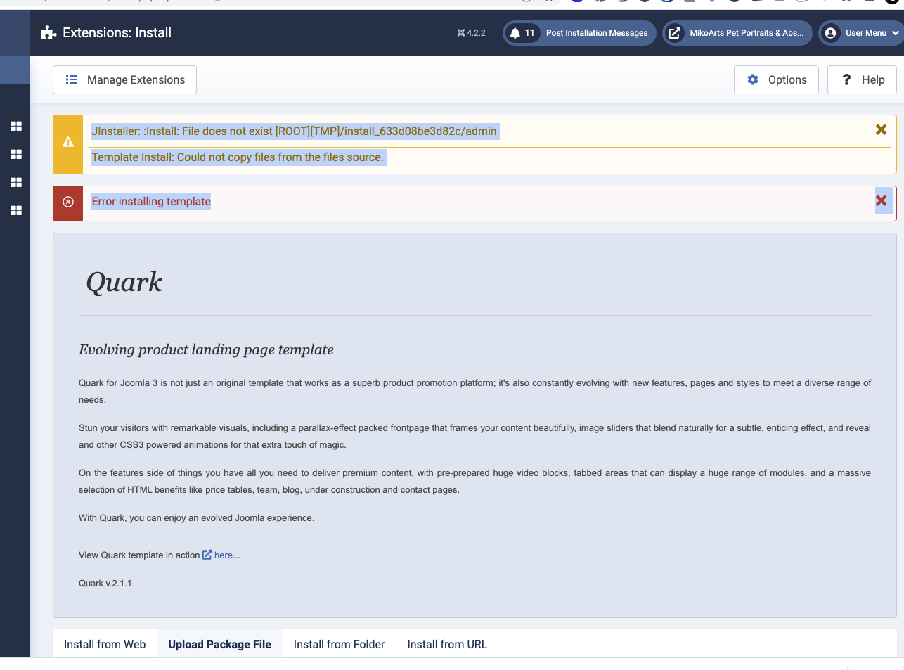The site is running Joomla 4 from a fresh QuickStart Quark J4 file from the Gavick Downloads section, and is throwing the UPDATE TEMPLATE warning. But the 2.1.1 Quark file in the downloads section of your site keeps failing to install. There is no other update file in the downloads section of your site that appears to be "the correct one," so we're assuming that your Q2.1.1 file is incorrect or corrupt somehow.