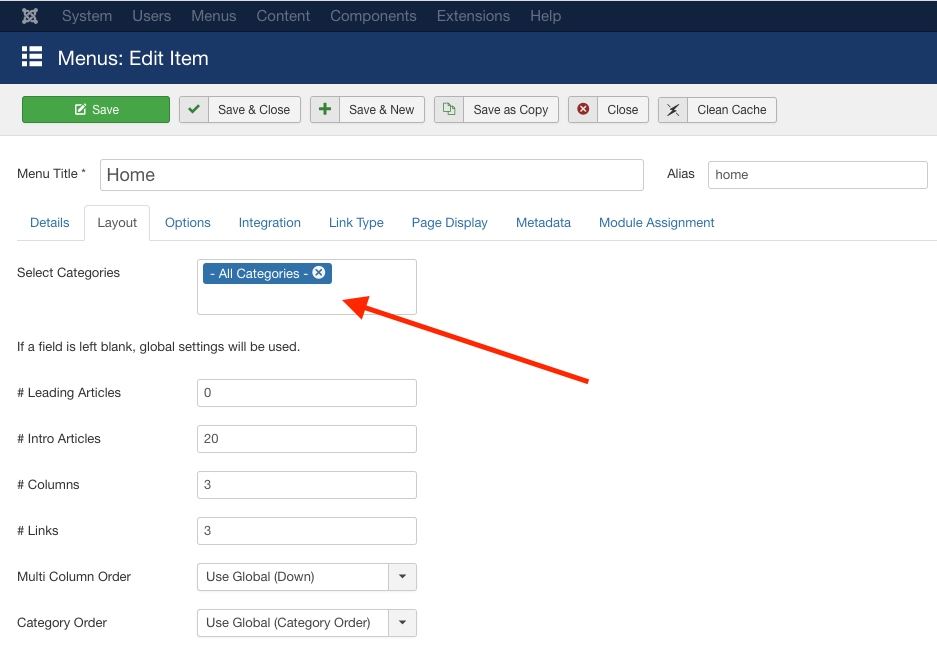 In the 'Home' menu item settings, you can select categories that you want to show articles from: