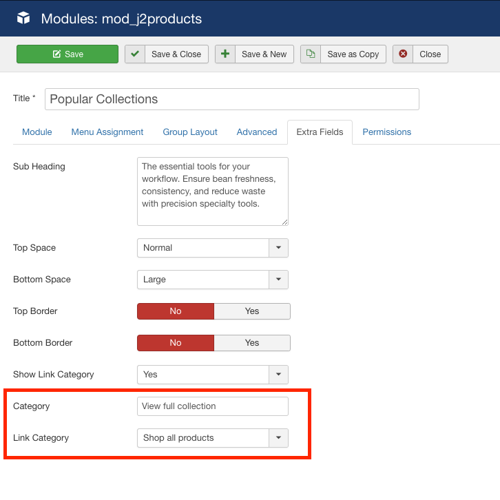 When i set Link Category to the "Collections" menu item, it goes to "/?Itemid=726" which is also a broken link.
