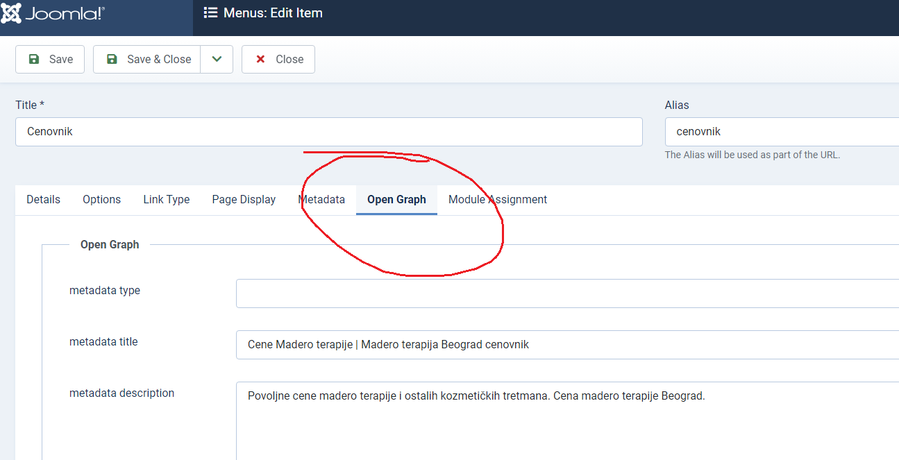 Hi, it is not from Joomla extentions, it is in some JoomlArt templates. For example n JA SPA. Menu item is having tab "open graph".