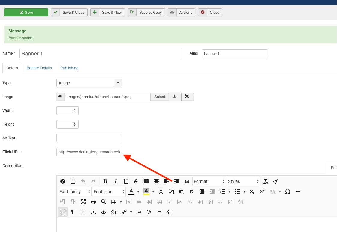 Hi, I noticed the image on banner-1.png on banner module in section 3 on the home page goes to the link: http://www.darlingtongacmadherefoundation.org/Somalicharities/index.php/component/banners/click/1 and I would like to link it to a different page or unlink it but cannot see anything to do this. Could you please help